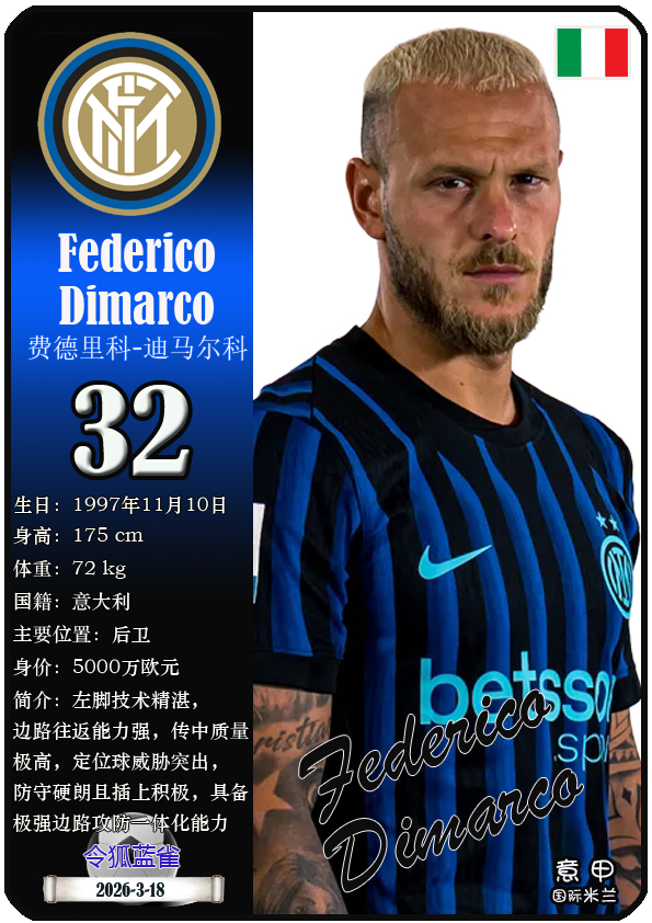 截至2026年3月19日,意大利足球甲级联赛身价为5000万欧及以上的球员共10名,本期盘点该10位球员(按所属俱乐部分类排序):