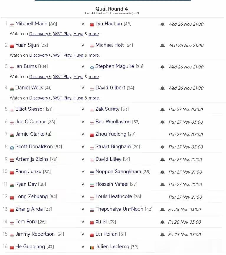 刚刚结束的英锦赛资格赛决胜轮48进32比赛,中国袁思俊出局,周跃龙、吕昊天晋级正赛!1、马奎尔6-1横扫佰恩斯率先晋级正赛;