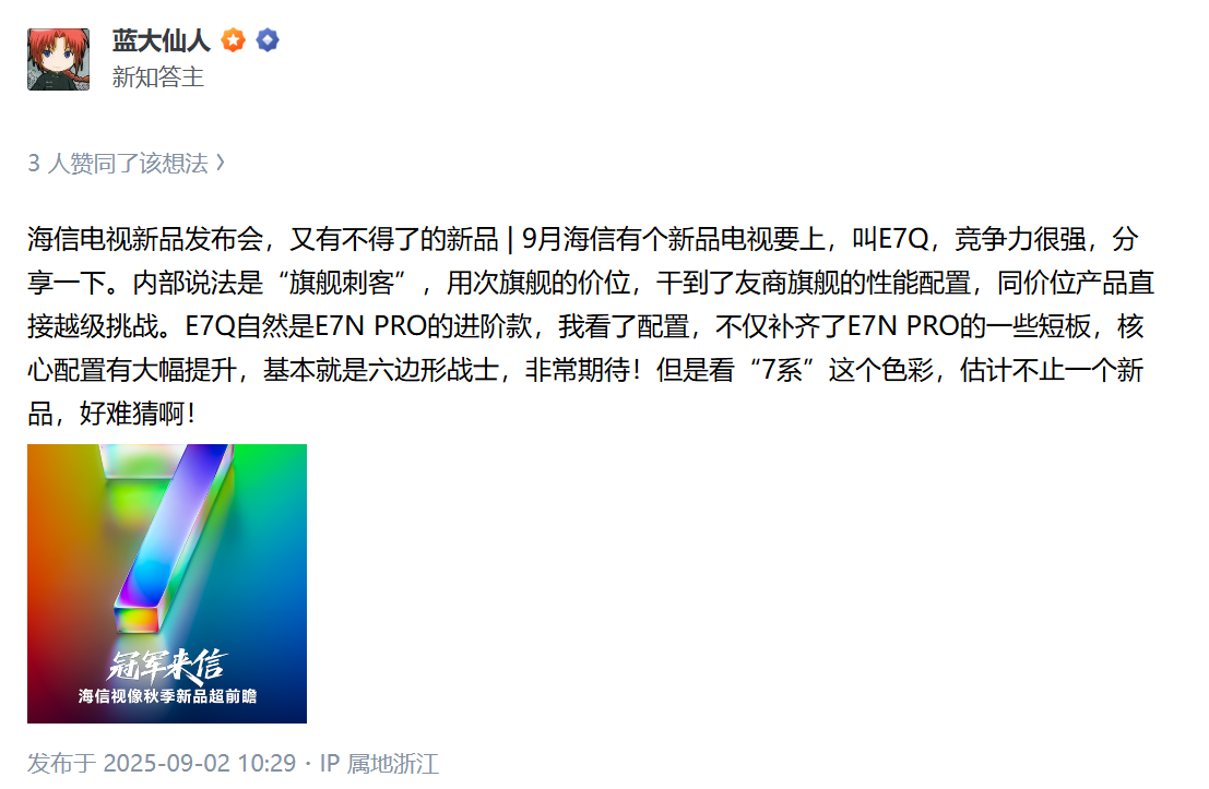 这种“用实质性创新打破期待阈值”的逻辑,在Mini LED电视领域同样上演,即将在9月下旬发布的海信E7Q正以“旗舰刺客”的姿态,延续着“挤爆牙膏”的市场法则。