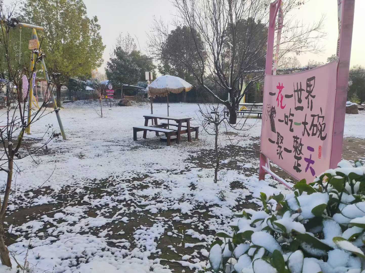 雪已经停了,阳光透过云层洒在三秋醋博园的雪地上。工作人员已经开始小心翼翼地清扫主要通道,确保游客安全。