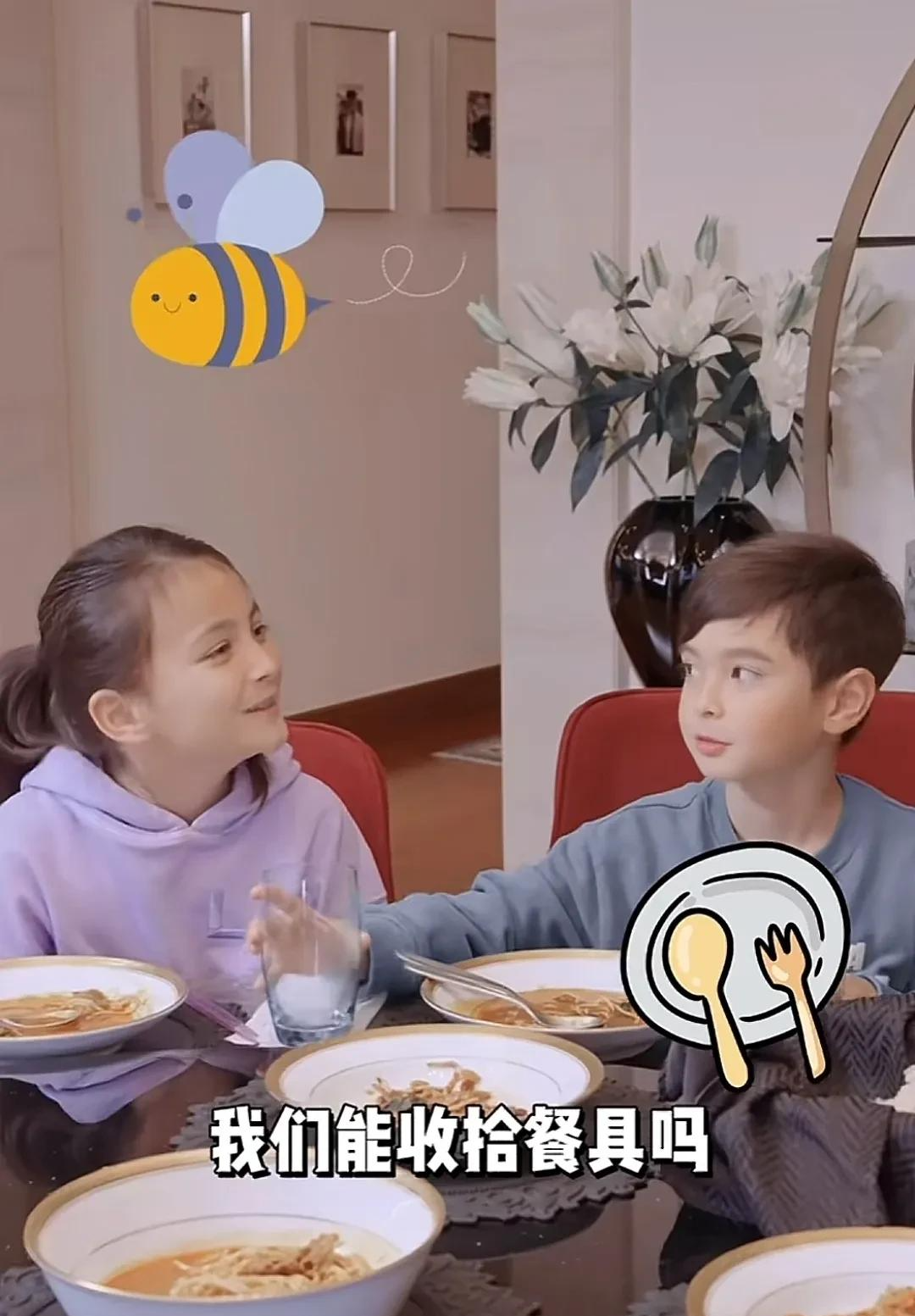罗伯特会锻炼孩子的动手能力,两个孩子也很听话主动端盘子收拾桌子。