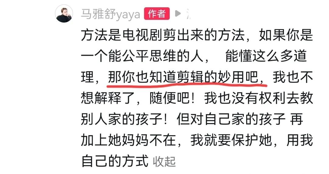 许多网友不理解马雅舒的行为,直到现在马雅舒终于说出了原因,她表示自己作为继母只想保护女儿,而且节目中很多矛盾点都是节目组剪辑出来的,很多都不是事实,马雅舒解释后才真相大白。