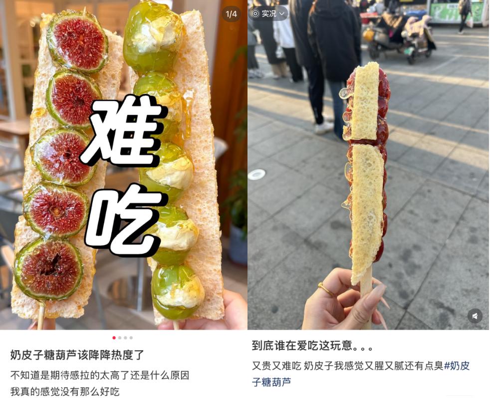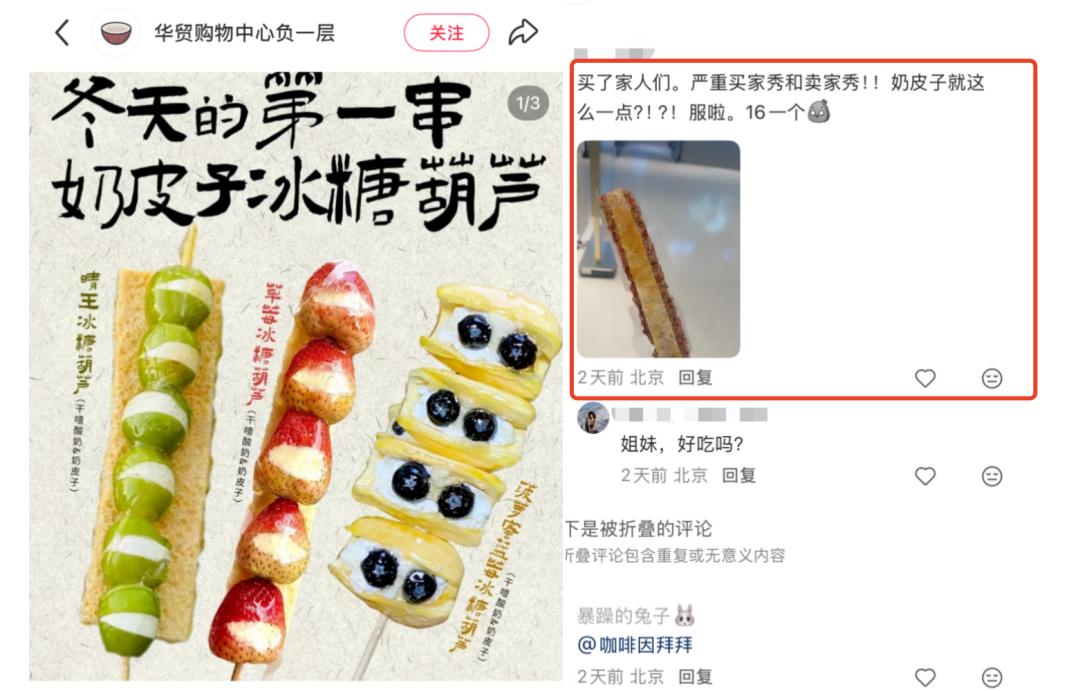 另一方面是行业乱象的集中爆发。市场上的奶皮子质量参差不齐、规格缩水,甚至出现了“造假奶皮子”。这些短期的逐利行为会消耗消费者的信任、透支品类的生命力。TOP君观察到,华贸购物中心最新推出的奶皮子糖葫芦就因奶皮子太小,被消费者吐槽货不对板。而不少跟风尝试的消费者也在社交媒体上表示,吃一次图个新鲜,不会复购。