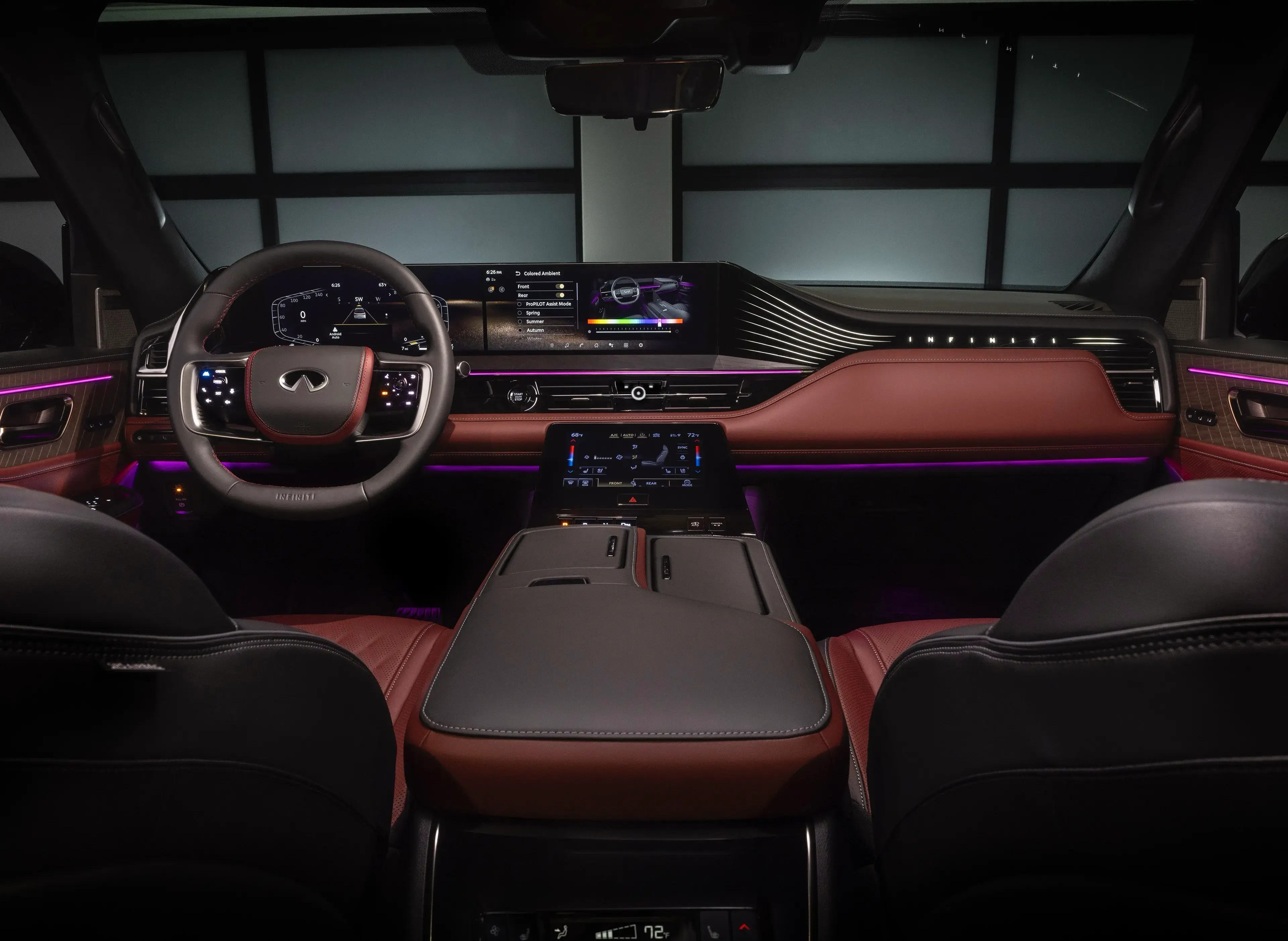 进入到车厢,QX80内饰明显要传统不少,双联屏与贯穿式设计,整体以简约、宽大的视觉效果为主,实体按键也大幅减少。个人认为整体豪华感相较于老款会逊色一些。当然了,酒红色内饰与座椅复杂缝线还是很有传统豪华燃油车的味道。全新QX80采用了三排7座或8座设计,高配的中排独立座椅非常豪华,用料也更加高级。