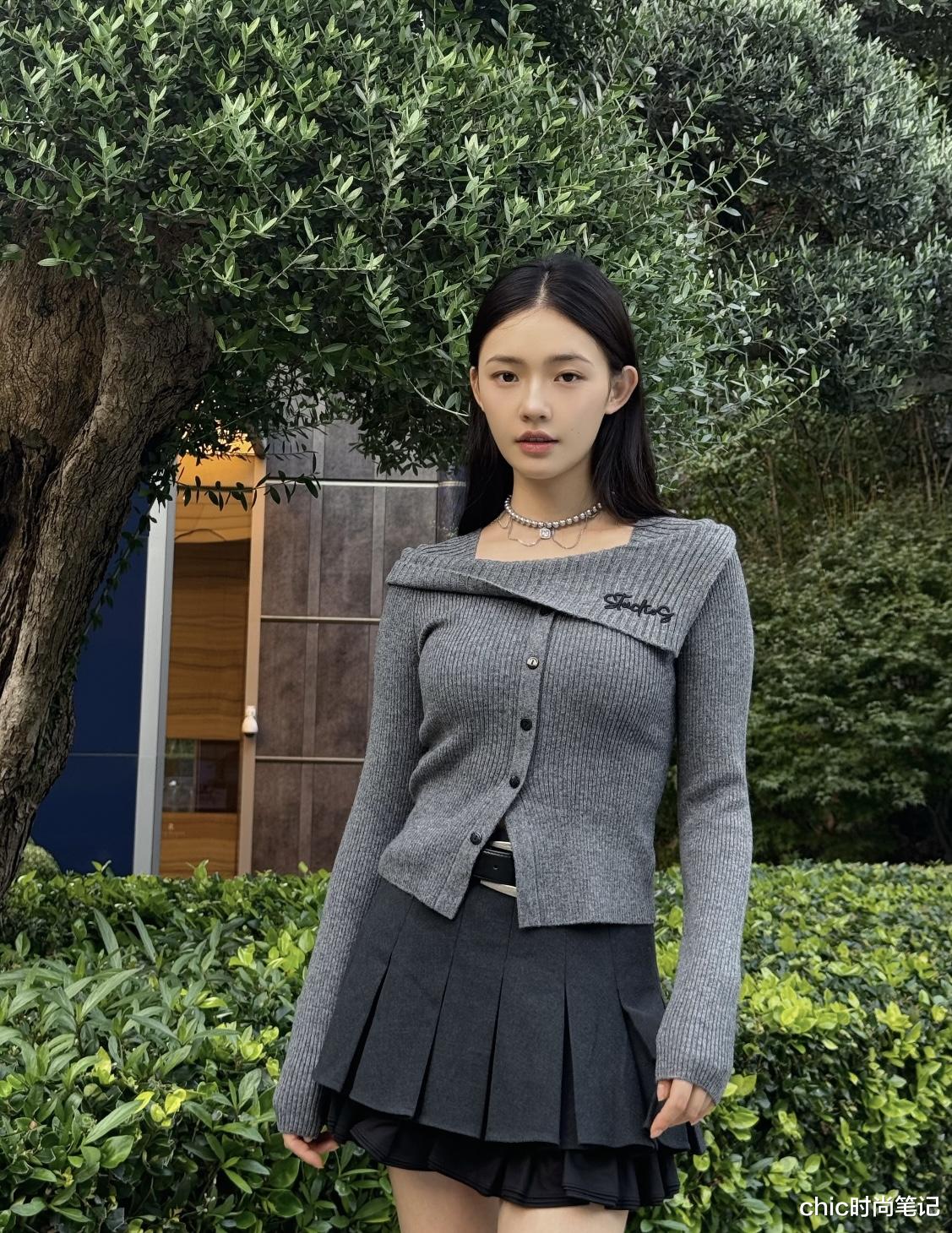 上衣是浅灰色针织开衫,针织衫的领口非常有设计感,自带一字肩的俏皮,下身搭配深灰色百褶短裙,非常减龄学院风的look,日常穿搭超百搭。