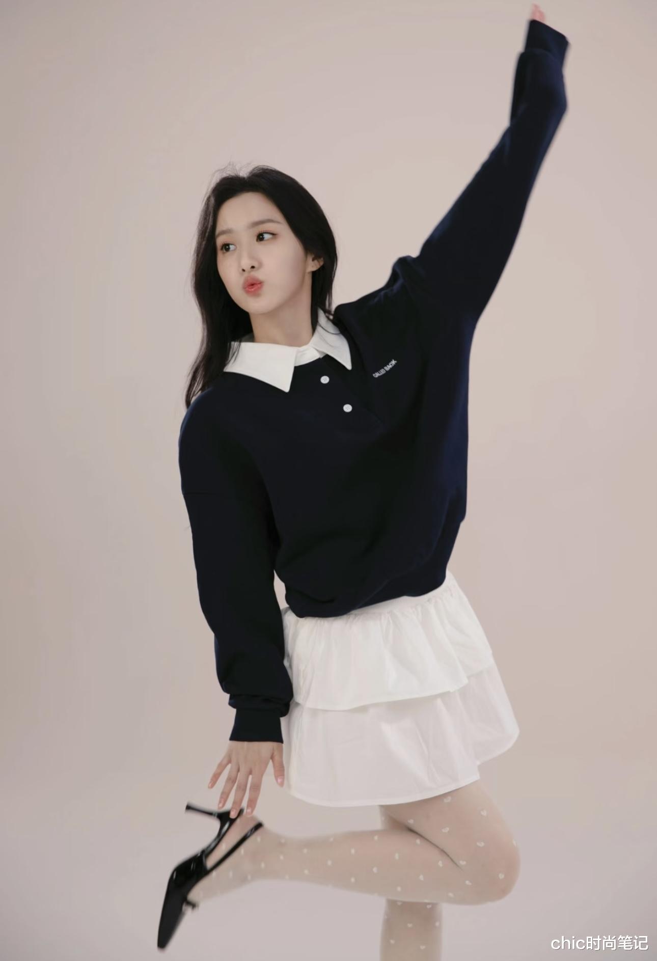 白色衬衫+黑色针织上衣+白色蛋糕短裙就很有miu系风格,经典的白+黑+白的穿搭让色系层次感十足,视觉上带来更大的时尚效果。