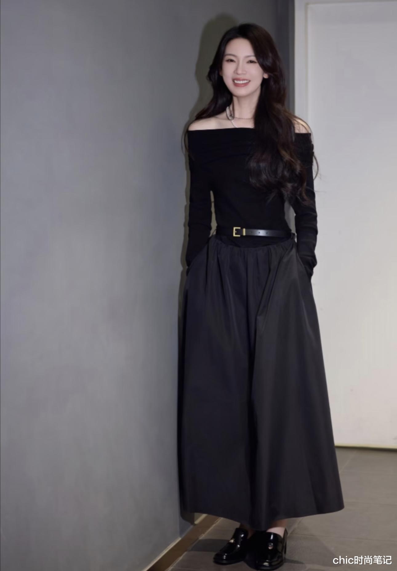 黑色一字肩上衣做了修身的版型,衬托得陈瑶身材纤细苗条,下身选择一条纯棉A字长裙,裙身廓形笔挺,配上优雅腰带温柔气场满满。