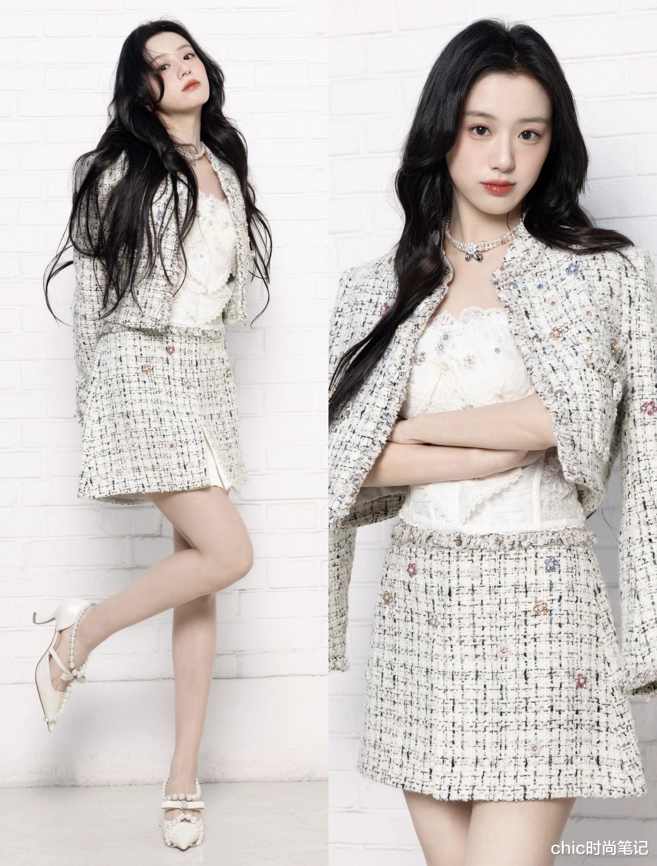 包上恩甜美的长相配上小香风服装真的适配度拉满。白色粗花呢小香风套装裙内搭白色蕾丝鱼骨吊带,珍珠项链和珍珠高跟鞋的点缀更有娇俏大小姐的感觉了。