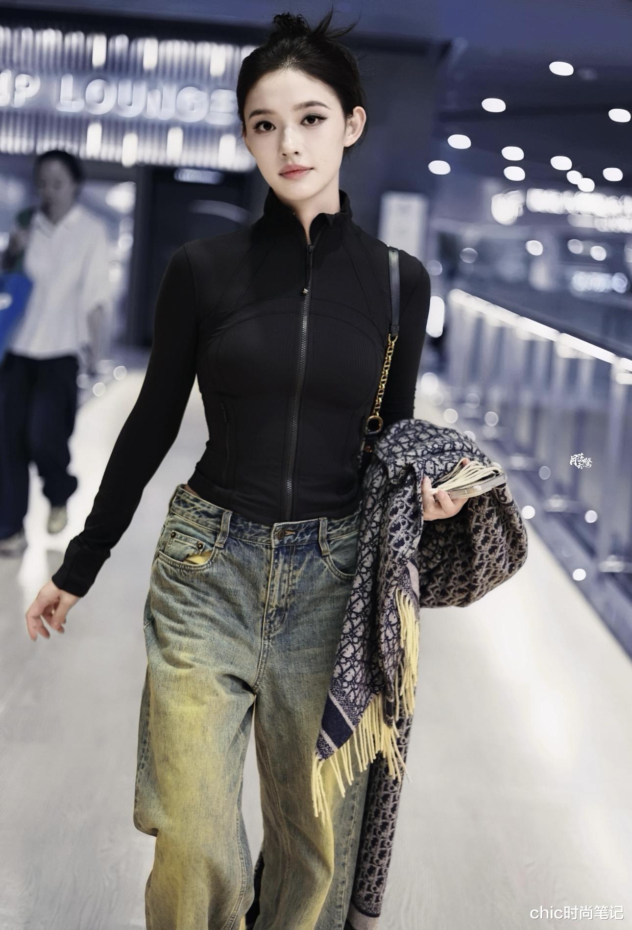 黑色修身款上衣展现玲珑曲线,下身搭配一条做旧款低腰牛仔裤,复古随性的美轻松展现,配上一条羊绒披肩,松弛又优雅。