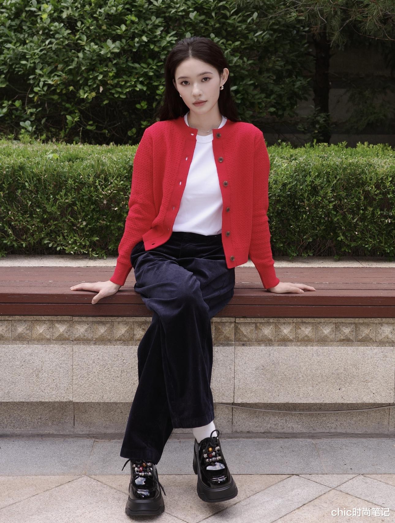 白色T恤+红色针织衫特别显白显气色,下身可以搭配长裤or长裙都很温柔,很有知性大姐姐的优雅气质。
