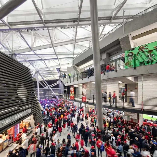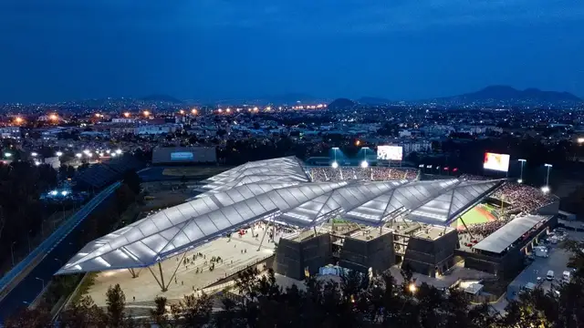 建筑的基座由6座覆盖本地火山岩的平顶金字塔构成,顶部设有餐饮区与公共平台,既呼应了中美洲古老神庙的意象,也为观众提供了远离看台的社交空间。这些体量不仅唤起人们对墨西哥悠久历史的记忆,更创造出一种兼具仪式感与现代性的入场体验。
