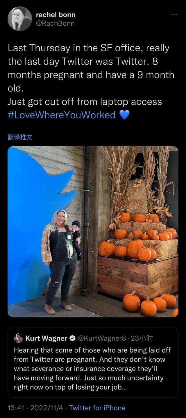 推特旧金山的(前)内容营销经理Rachel Bonn,一名怀孕8个月的推特员工,面对“缺席判决”,用一张自己挺着大肚子、抱着9个月大孩子站在小蓝鸟logo前的照片,告别了这份工作:没想到,上周四在旧金山办公室,是我在推特的last day。