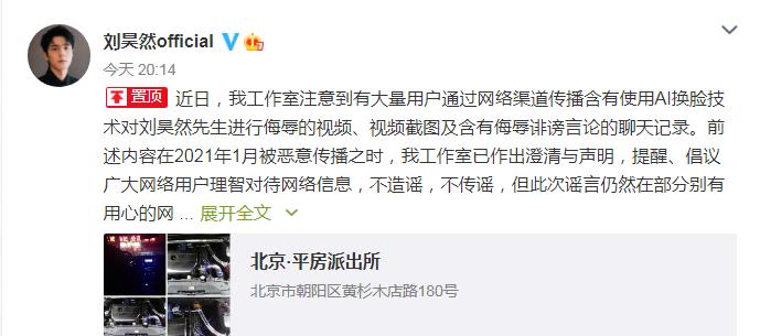 8月28日晚间,刘昊然工作室发文称,有大量用户通过网络渠道传播含有使用AI换脸技术对刘昊然进行侮辱的视频、视频截图及含有侮辱诽谤言论的聊天记录,对此,工作室已于今日向警方报案。