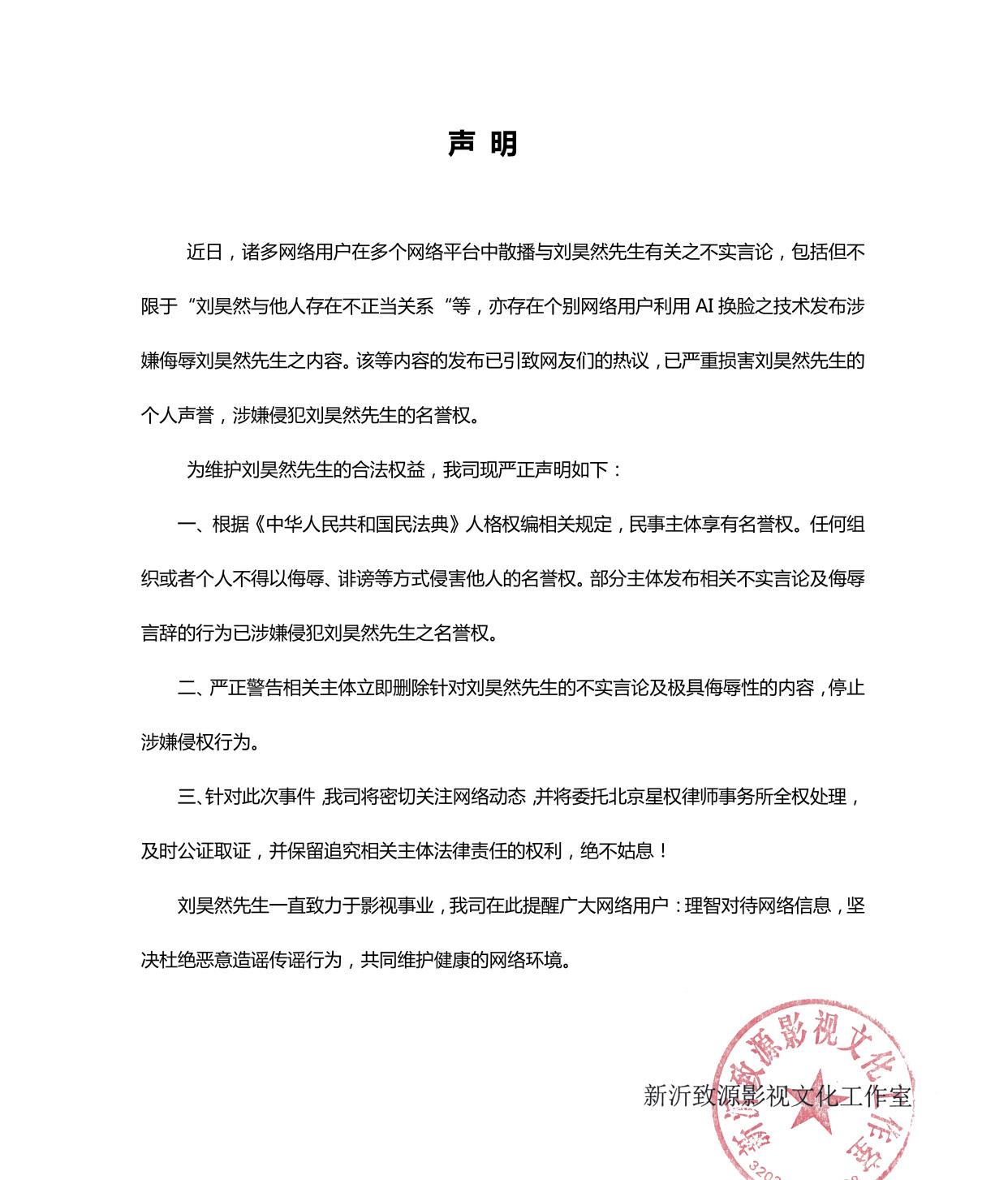 对此刘昊然一方非常愤怒,1月22日,工作室发出严正声明,对部分网友的侮辱污蔑行为进行警告。