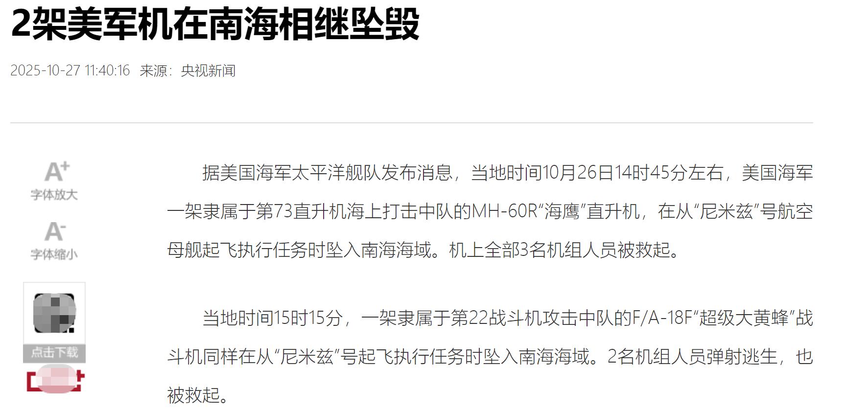 26日,美国海军太平洋舰队在一小时内坠毁了两架军机,一架MH-60R“海鹰”舰载直升机,一架F/A-18F“超级大黄蜂”舰载战斗机,这两架军机同属于“尼米兹”号航母打击群。