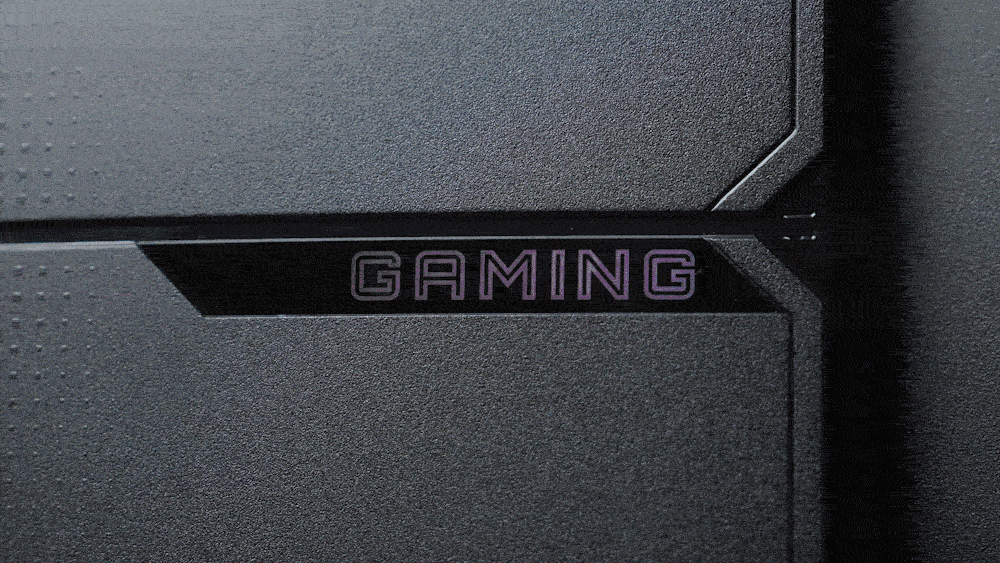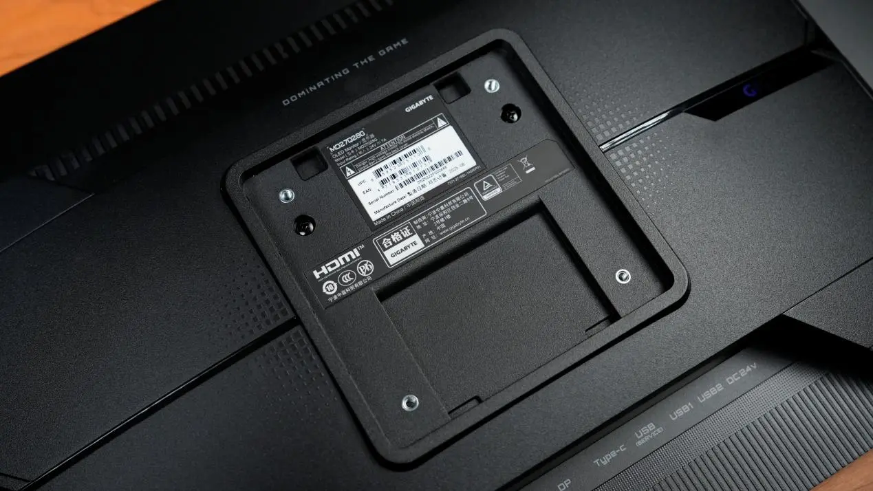 在MO27Q28G背面右侧嵌入了技嘉品牌Logo,采用特殊的镀膜工艺,具备棱镜反光变色效果:水平角度下,当视线方向与光源不同侧时,就会显示出“GAMING”;而当视线方向与光源同侧时,则会出现“GIGABYTE”字样,这个小彩蛋让原本简约的背面多了几分精致感,低调中尽显品牌辨识度。