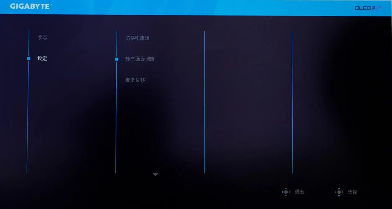 向左拨动摇杆就会开启OLED CARE设置界面,包含智能像素清理、静态画面调暗、亮度稳定等功能,通过AI OLED Care技术实时监控像素状态,从硬件层面降低烧屏风险,以应对在突然离开情况下显示器长时间待机下会出现积热导致的显示问题。