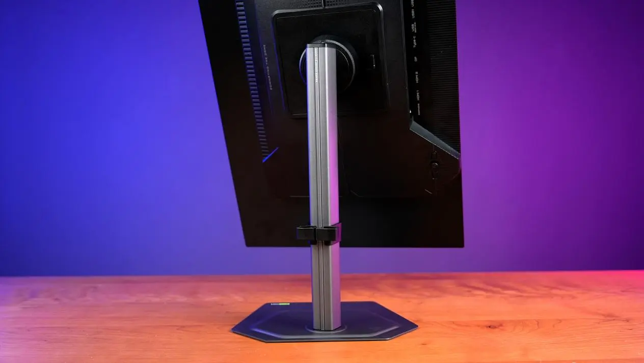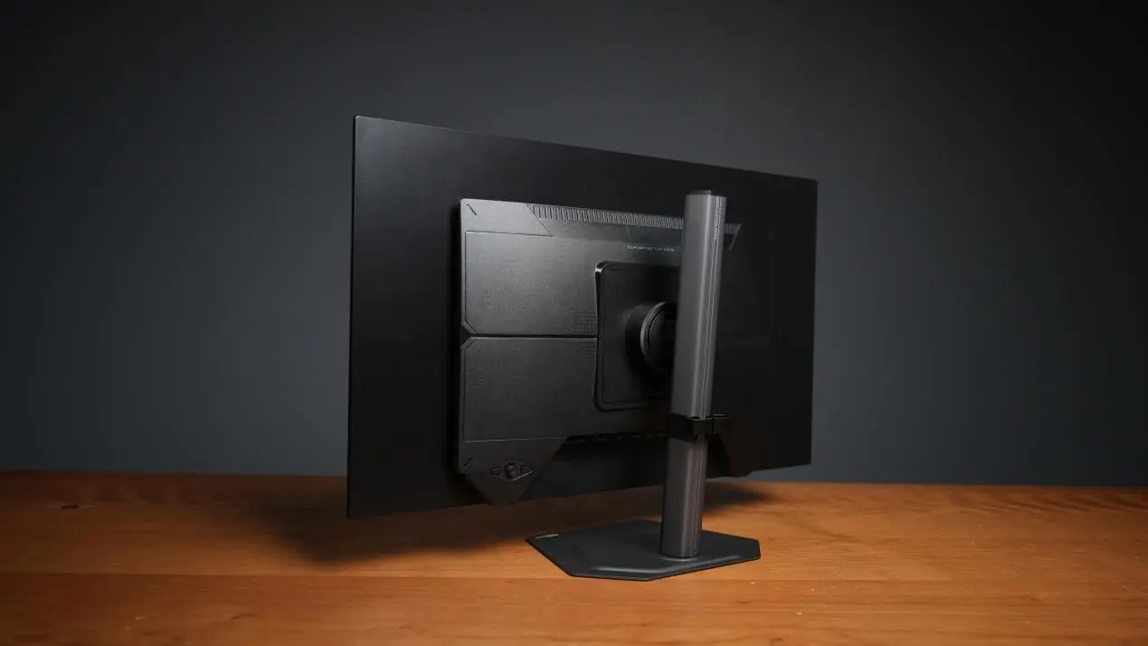 MO27Q28G的背面设计暗藏诸多实用细节。背面主体采用磨砂质感处理,触感细腻且不易沾染指纹,日常擦拭清洁十分方便。在背面中部,设计有形似的“背包”的驱动模块,相较于前几代来说,体积更加的小巧,这种设计并不会影响散热:除了侧面的散热孔外,背面驱动模块“背包”的顶部和底部也分布着细密的格栅式散热孔,这些散热孔采用倾斜式设计,既能防止灰尘直接落入机身内部,又能形成“上下对流”的散热通道,确保这款电竞显示器在长时间高刷新率运行时,内部温度始终保持在合理范围,避免因过热影响屏幕寿命或显示效果。