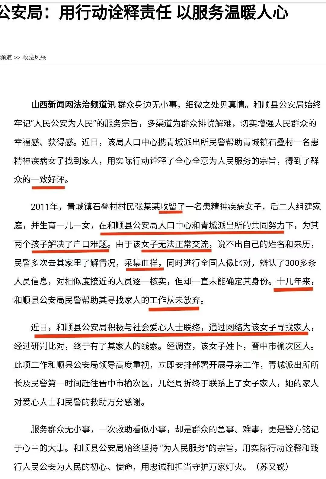 不难看出,张某“收留”了女硕士,不仅多年来没被追究责任,反而被当地当成了正能量典型。新闻更是借机宣扬,当地为两个孩子解决了户口难题,十几年来从未放弃为女子寻找家人,辨认了300多条人员信息......得到了群众一致好评。