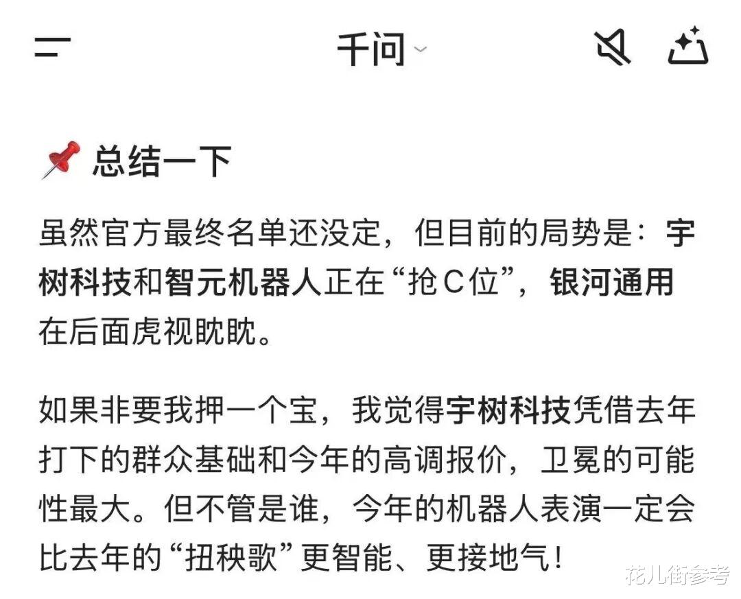 去年是宇树科技的花袄儿机器人扭秧歌,今年谁有这个登台机会?反正看热闹不嫌事儿大,这个问题我也抛给了千问: