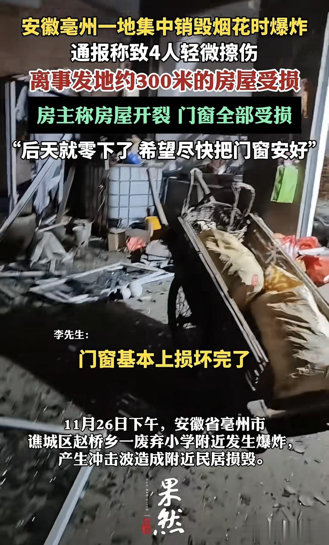 11.26日下午,安徽省亳州市赵桥乡一附近废弃小学发生了突然的爆炸,周围的村民都感到震感明显,房屋部分损坏另有4人轻微伤。
