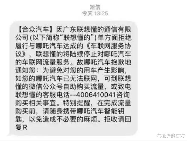 在此之前,哪吒车型“断网”事件就引发广泛关注。不少哪吒车主表示收到短信通知,由于广东联想懂的通信有限公司单方面拒绝履行《车联网服务协议》,将陆续停止对哪吒汽车的车联网流量服务。