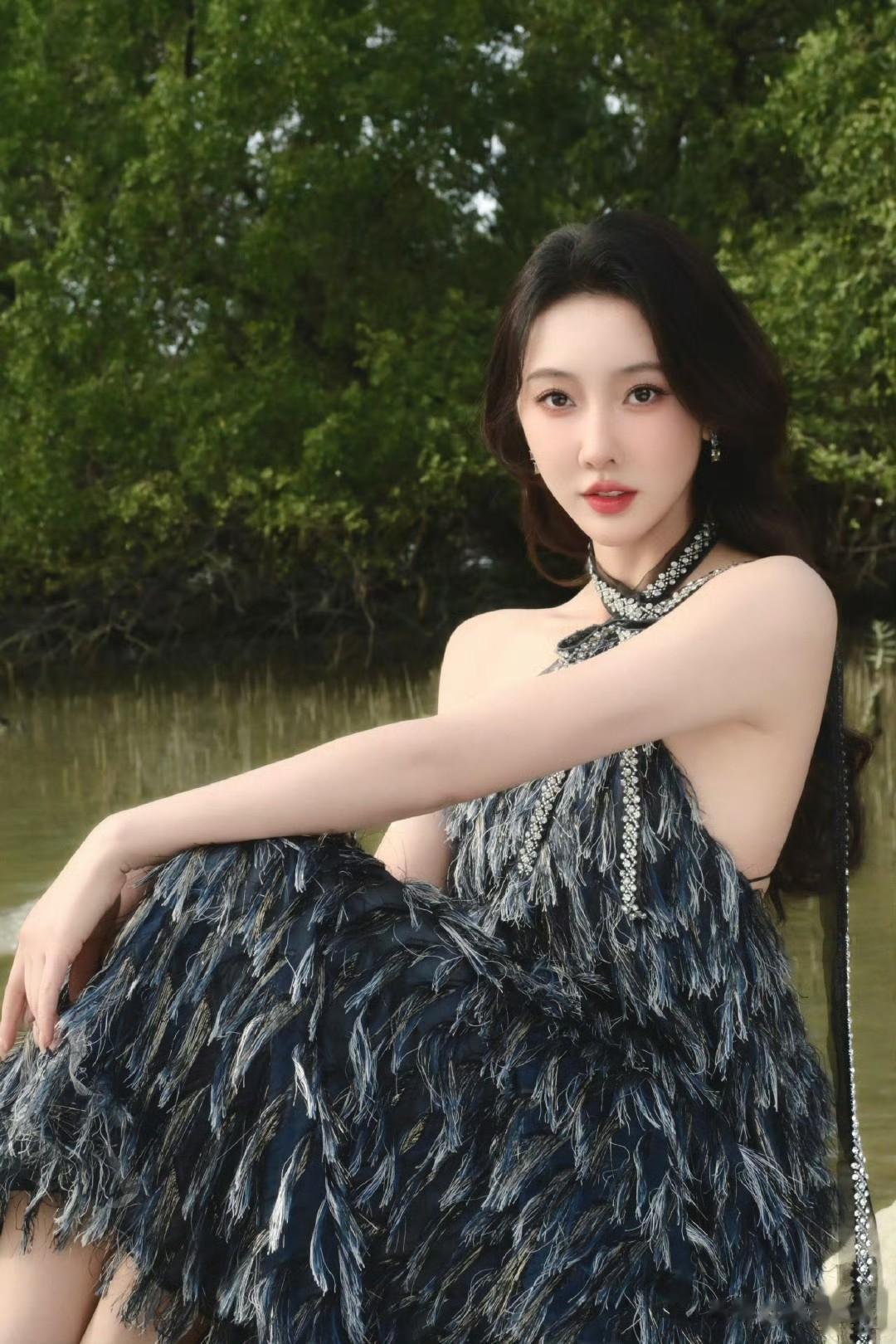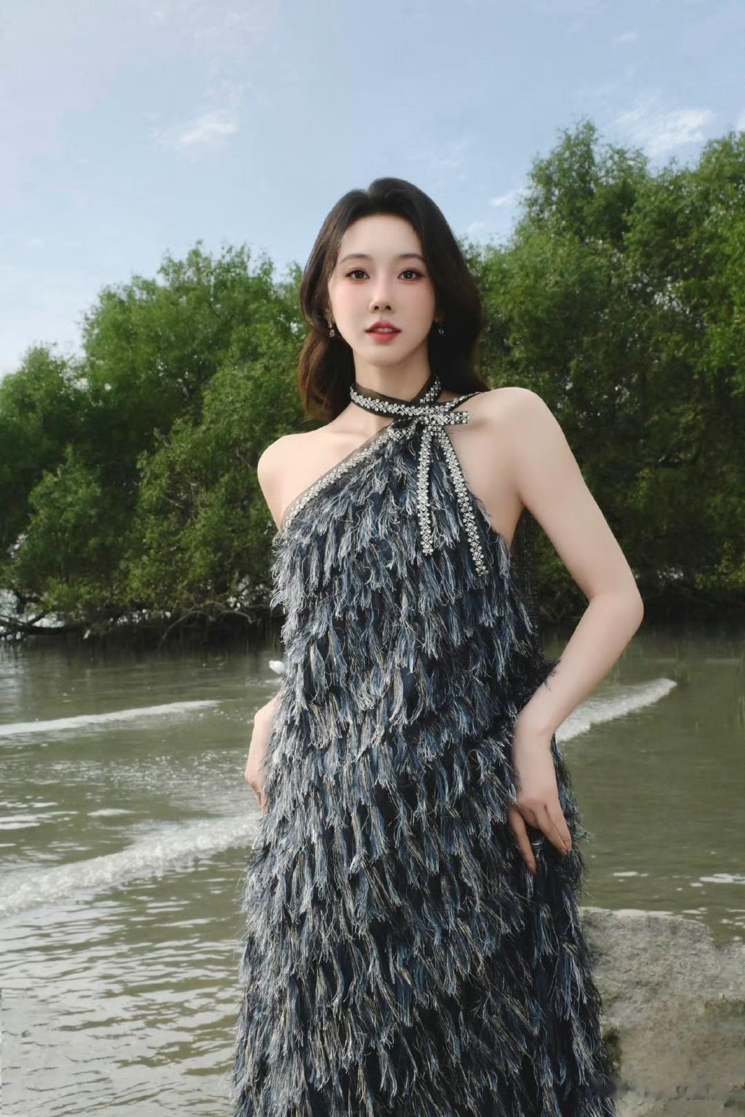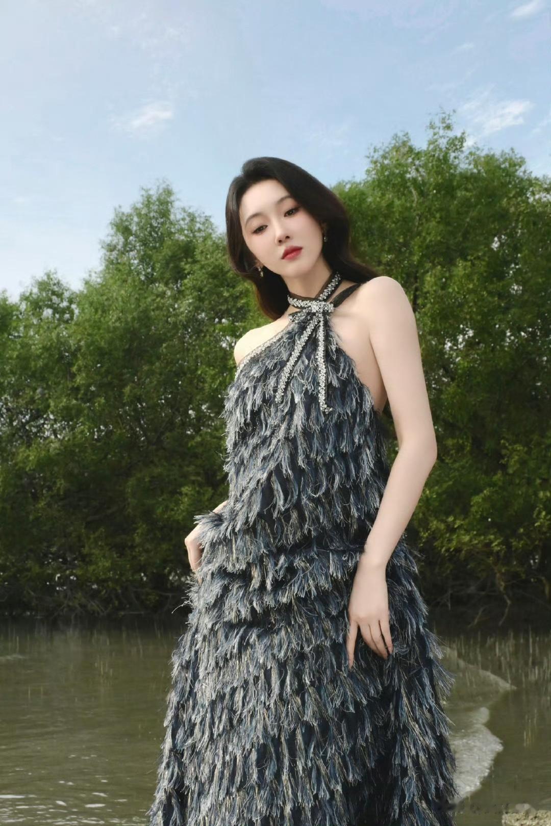 仙气飘飘,一眼沦陷的仙女穿搭,宣璐的春日造型太出圈!挂脖羽毛裙轻盈飘逸,勾勒出曼妙身姿,在原野间自带柔光滤镜。简约妆容搭