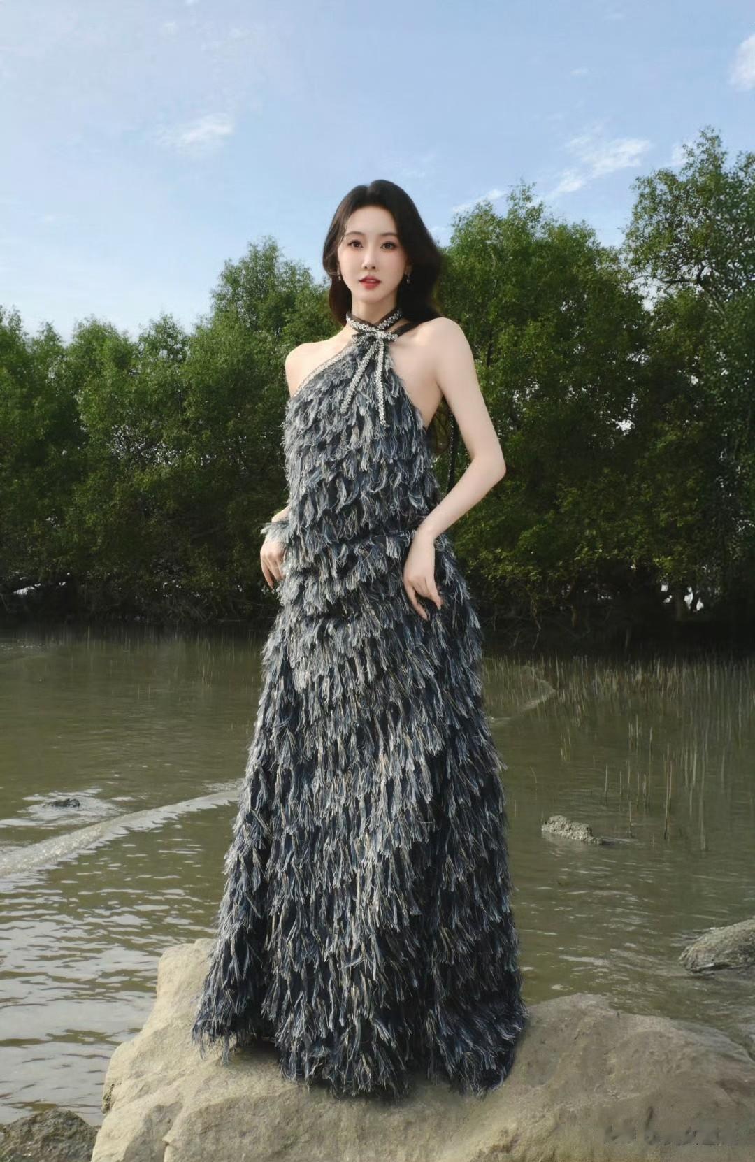 宣璐春日穿搭:穿挂脖羽毛裙原野小仙女