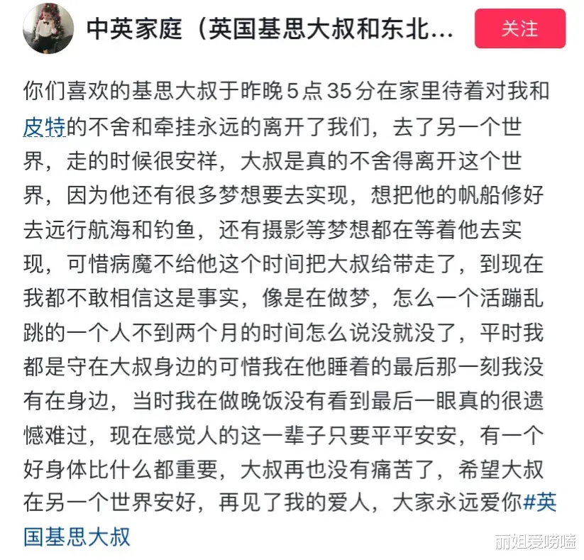 可惜这次却在他睡着,最后的那一刻,没有在他身边,当时自己在做晚饭,没有看到最后一眼,真的感觉非常遗憾,同时还告诫大家认证一辈子,别想着有钱没钱,只要平平安安,有一个好的身体才是最重要的