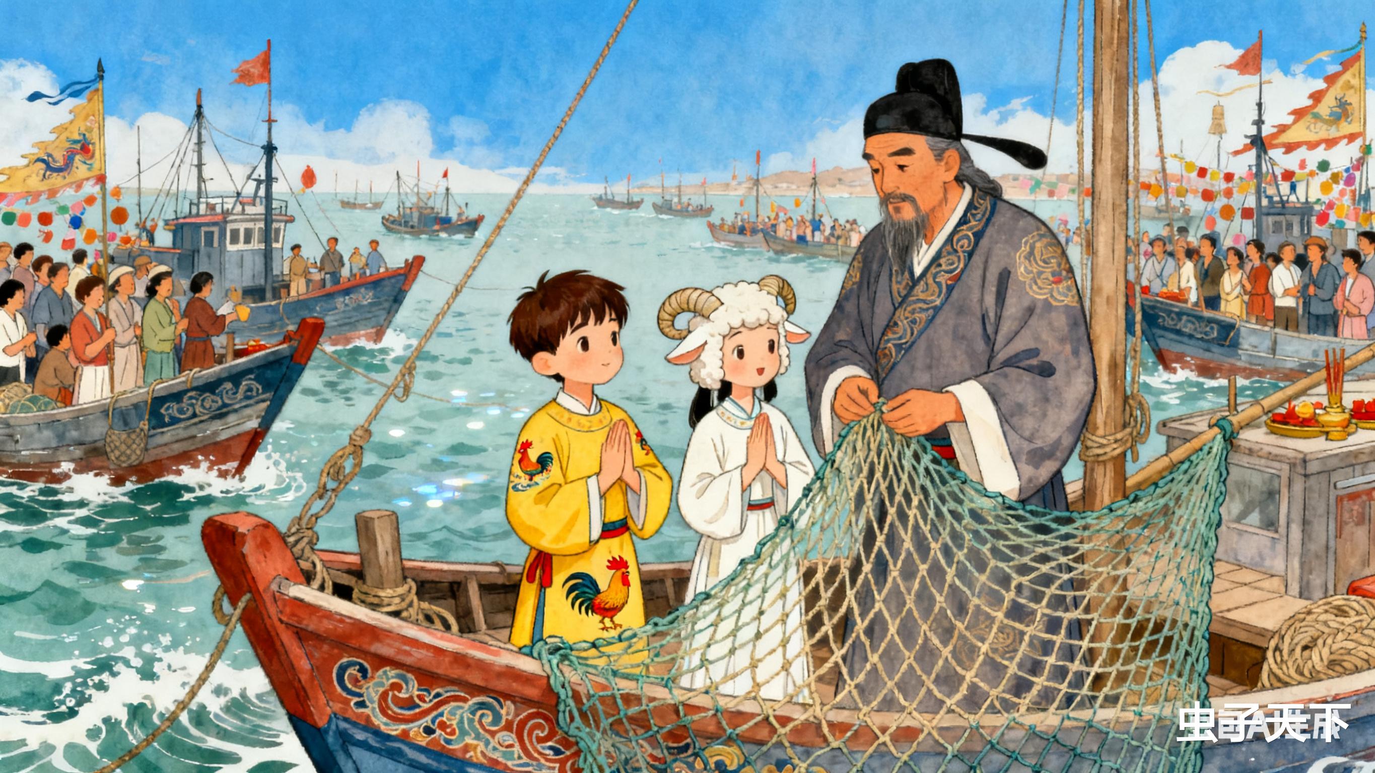 每逢开海节,俩孩子就跟着爹娘去祭海,船头上挂着的渔网,还是铁山当年织的那张,结实着呢。