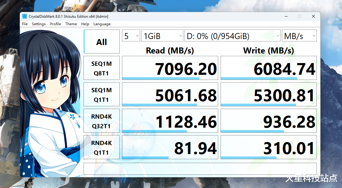 顺序读写采用 Q8T1 设置,4k 随机读写采用Q32T16 设置,经过实测,顺序读取速度为7098.2MB/s,顺序写入速度为6084.74MB/s。