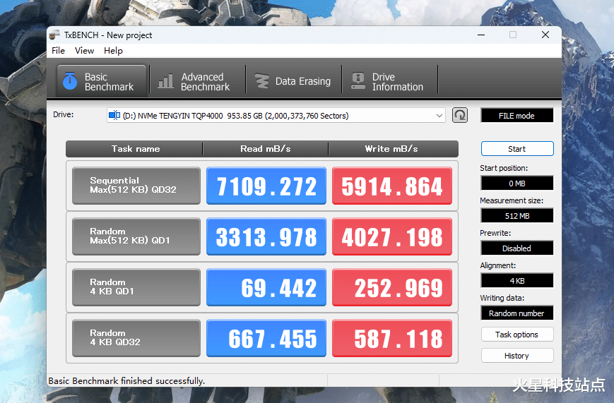 在TxBENCH测试中,读取速度为7109.272MB/s,写入速度为5914.864MB/s。