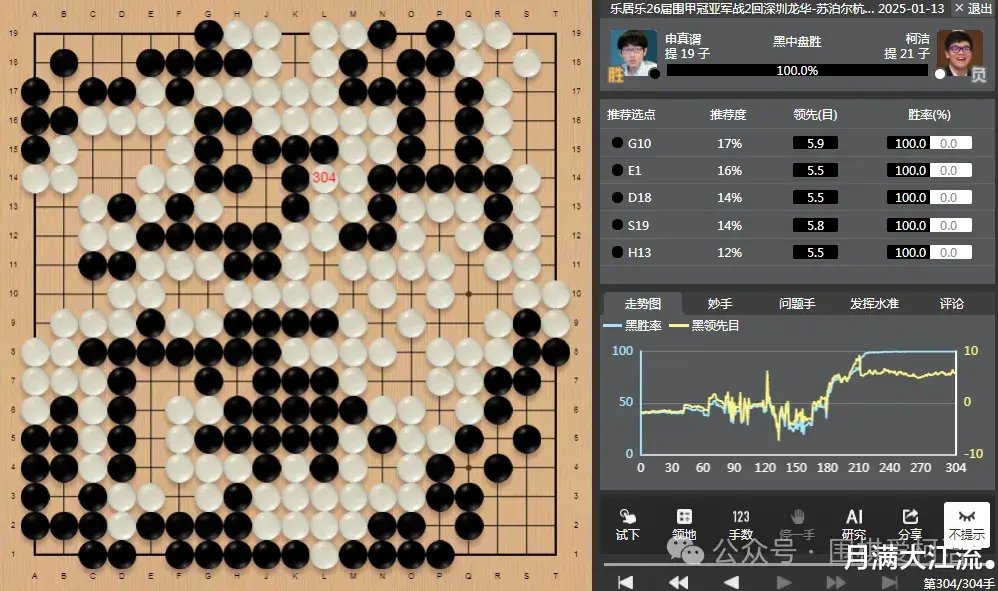 这场比赛,柯洁展示出了极佳的竞技状态。双方一共下了304手,在180多手的时候,双方都是旗鼓相当,柯洁一直保持微弱的领先。这在申真谞近期的对局中可说是罕见,正常情况下都是申真谞压着对手打,而被对手压着打的情况非常罕见。