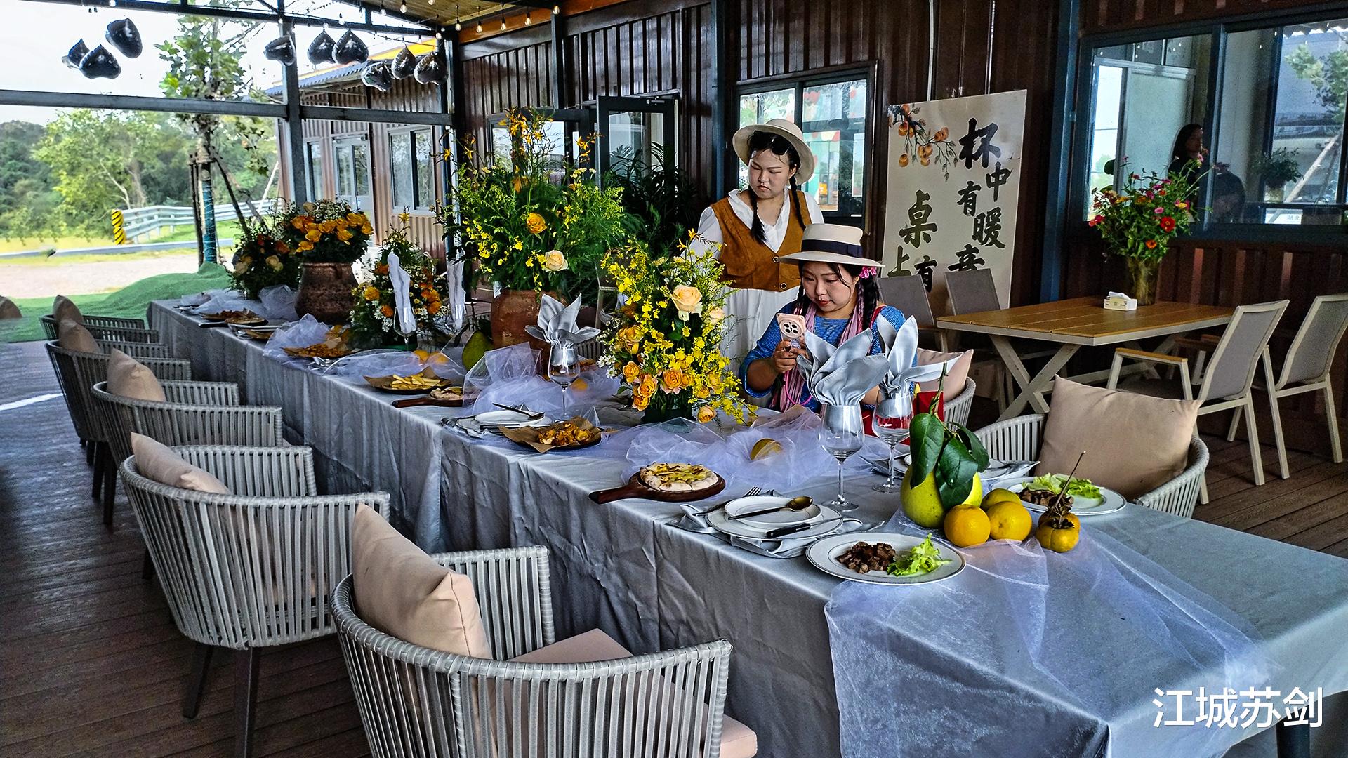 此刻,时间被调成飞行模式:把披萨胚抛向空中,接住的是带着炭火香的热带海风;把牛排的汁水锁进刀尖,像给湖面的涟漪盖了个印章;把蓝山咖啡摇成一朵奶泡云,倒映着梁子湖的蓝;把鲜榨果汁举到夕阳里,和身边人碰杯——“嘭”一声,秋天被正式开封。