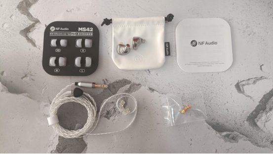 标配有四种尺寸的MS42硅胶耳塞,在发烧友的圈子里也小有名气,其采用食品级抗菌硅胶材质,拥有出色的佩戴舒适性,配合精心设计的声学结构,可以提升频率响应和谐波特性,顺带一提这套耳塞单独购买需要89元。此外,还有一个白色的皮质防水的收纳袋和一对可替换的黄铜导音管。