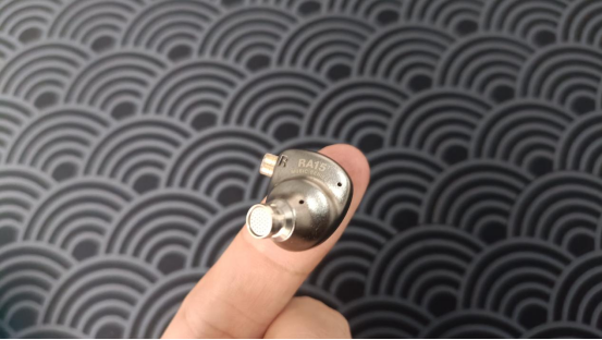 从耳塞正面可以看到RA15采用的依然是祖传的拨片造型面板,上面印有宁梵声学的品牌LOGO,兼具功能性与视觉辨识度。耳机还采用了可换线设计,方便玩家自行更换线材并有效延长耳机的使用寿命,为了避免玩家在更换线材时装反,也在耳机腔体印有耳机型号的一侧印上了L/R字符,凸起式的母座也很稳固,我这个自安装上去后还没有松动过。