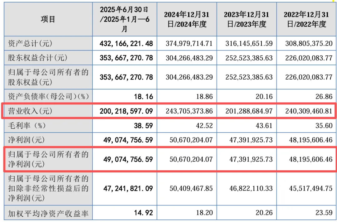 财务数据显示,2022年至2025年上半年,祺龙海洋营业收入分别为2.40亿元、2.01亿元、2.44亿元和2亿元,归母净利润对应为4,819.56万元、4,739.19万元、5,067.02万元和4,907.48万元。需关注的是,2023年,公司营收同比下滑16.24%,归母净利润同步出现1.67%的负增长。