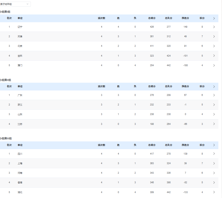 至此,成年男篮小组赛全部结束,八强球队为【辽宁、天津、广东、浙江、四川、上海、北京、山东】。小组赛积分榜如下
