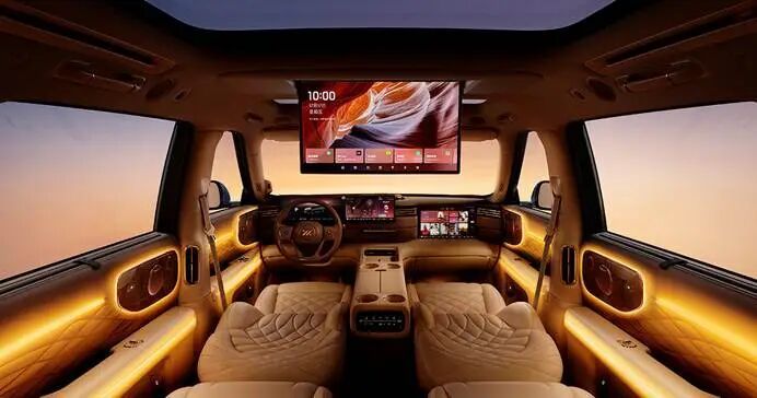 智己LS9被戏称为“陆家嘴大揽胜”,其设计气场十足:长超5.2米,3160mm超长轴距,搭配行业最长一体式贯穿灯带、游艇巡航的旗舰侧姿与星际线矩阵尾灯,视觉冲击力与优雅审美并存。内饰则集成了同级最大12.3L双开门冰箱、27.1英寸5K驾舱屏、15.6英寸副驾屏、21.5英寸二排娱乐屏等顶奢配置,将“冰箱彩电大沙发”的体验推向极致,并赋予了艺术木纹饰板与智能幻彩氛围灯等大师高定细节。