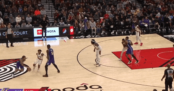 持球操刀“西班牙挡拆”(Stack),挡拆行进间先是观察艾顿的顺下位置,随后立即加速发动二次突破,乐福已经失去防守身位,罗威在被背掩护延阻后防守注意力全在艾顿身上,穆雷也没有帮助队友换防接管的打算,史密斯直接获得了一次上空篮的机会。