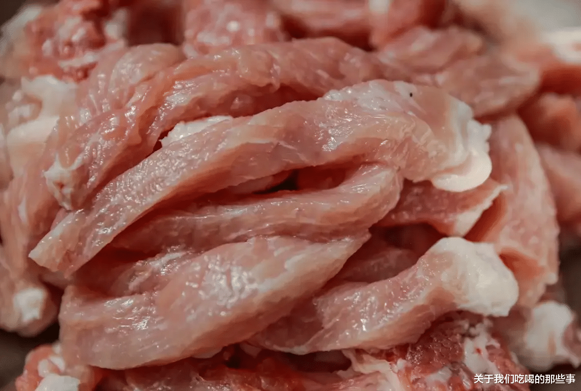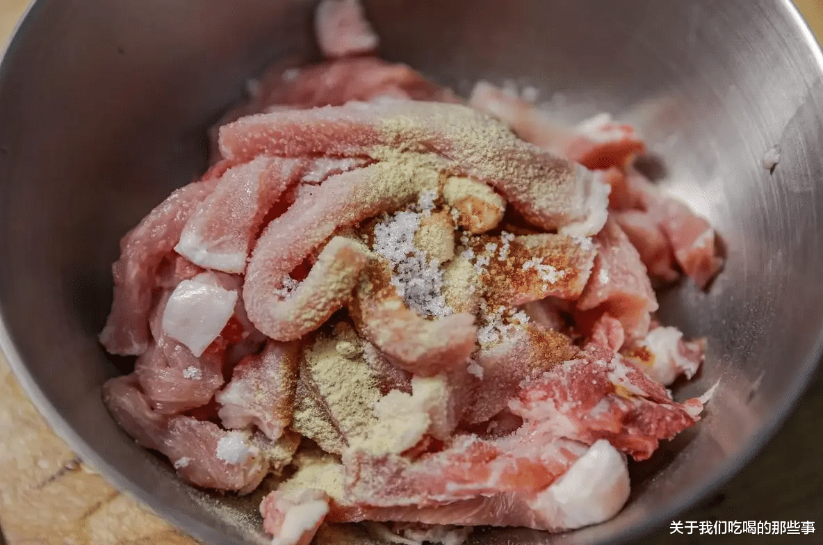 第一步,把猪肉切成稍微厚的片,再切成小粗条,不要过于细,也不要太粗,太细的话影响口感,太粗的话有炸不熟的可能。