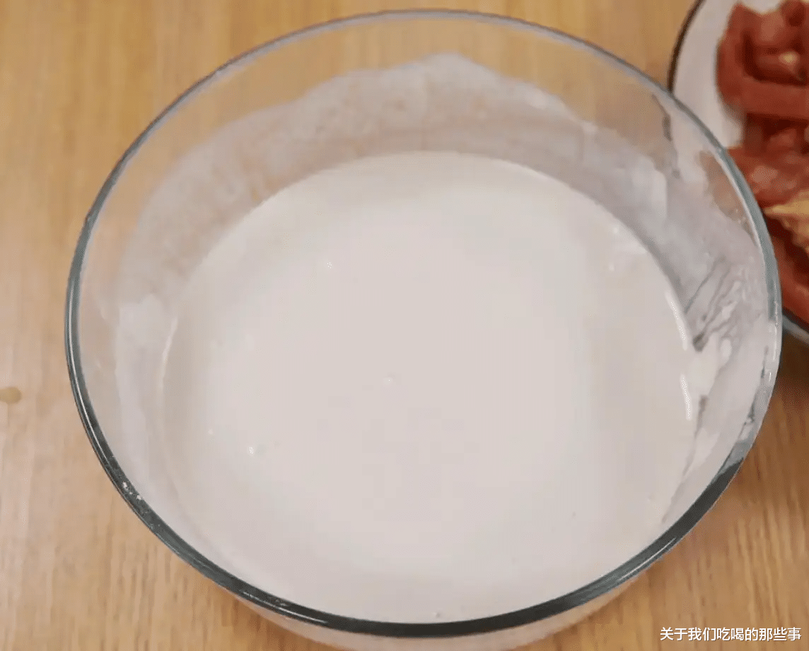 第三步,等腌好了,取一个空碗,加入面粉、淀粉,按一比一的比例放。然后加一些清水,搅拌到没有干粉,稠稠的状态,再加入啤酒搅拌,成稠酸奶状。若是喜欢啤酒的味道,也可以不加水全加啤酒。