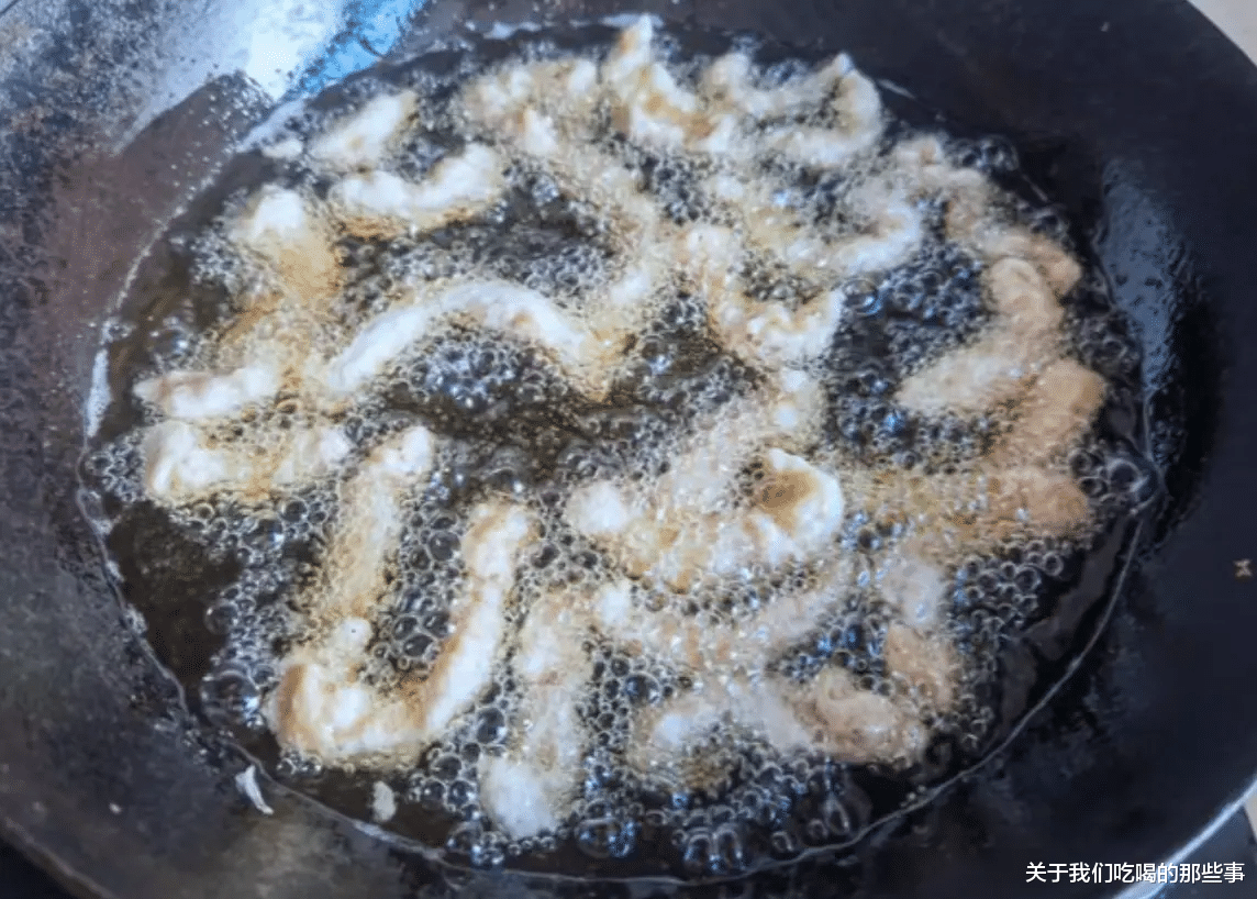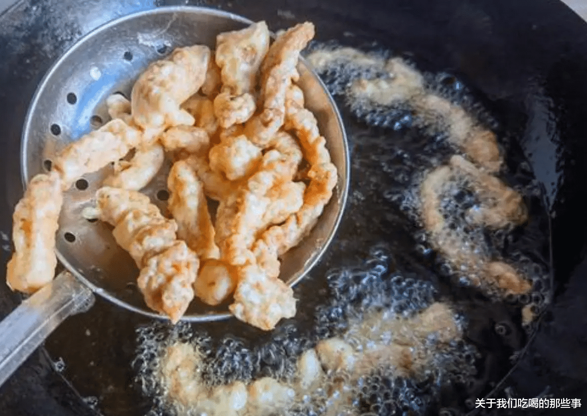 第七步,肉条入锅后炸到定型再翻动,炸成略微金黄的颜色捞出。
