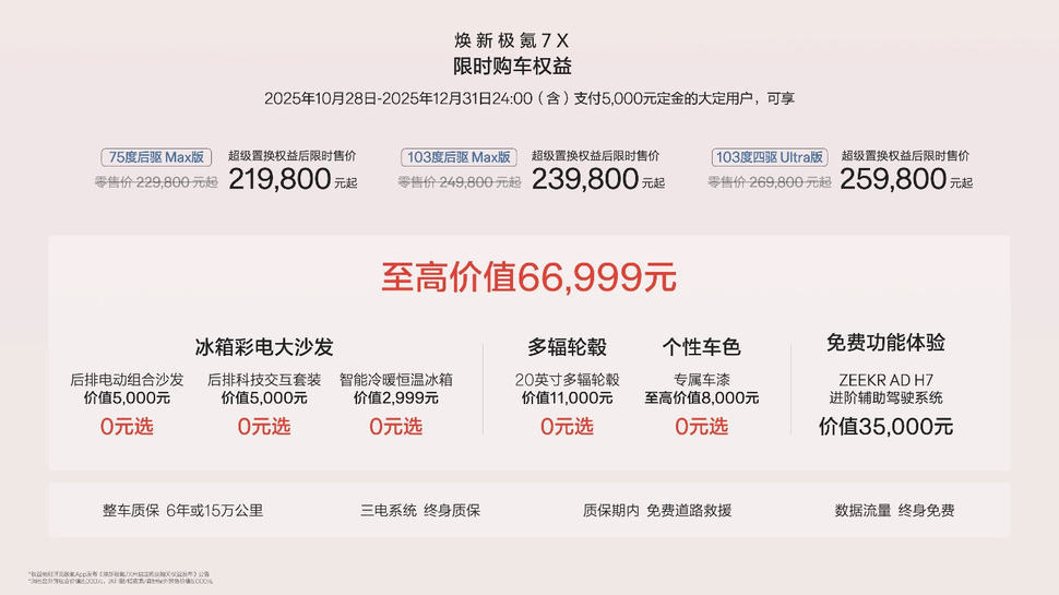 2025年10月28日至12月31日(含)期间支付5,000元定金的大定用户,全系赠送价值12,999元的冰箱彩电大沙发,全系免费升级20英寸265mm宽胎以及专属车漆,并可享价值35,000元的ZEEKR AD H7进阶辅助驾驶系统终身免费功能体验。 与此同时,首任极氪老车主增换购焕新极氪7X可享每年1000度的5年免费充电权益。此外,2025年11月30日(含)前,下定且锁单的用户,如因极氪原因,无法在2025年开票交付,导致无法全额享受购置税优惠,对于政策退坡产生的差额,极氪品牌提供至高13,500元的购车尾款抵扣。