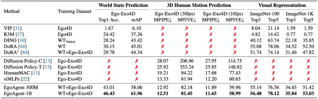 EgoAgent 在三项关键任务上均取得了优异表现,而现有模型通常仅能在其中一至两项任务上实现有效学习。