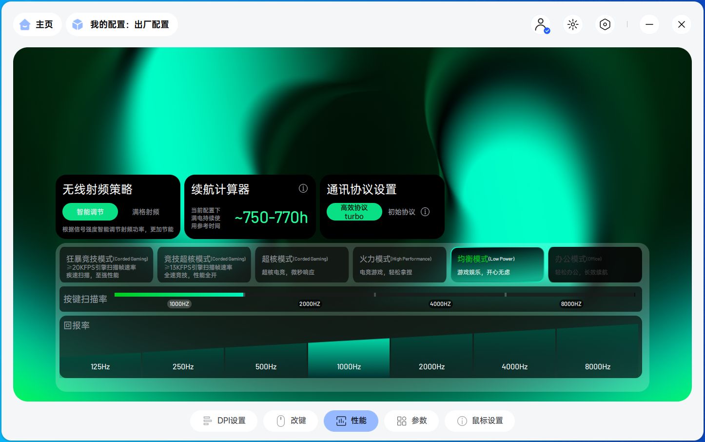 对无线鼠标来说,“续航短” 是最大的痛点:之前用的鼠标,1K回报率下只能用200小时,不到一个月就要充电;而VT1系列在Power +固件加持下,续航直接翻倍。1K回报率下能连续用750小时:我周末玩8小时,平时每天玩2小时,算下来能用到3个多月,不用总记着充电。