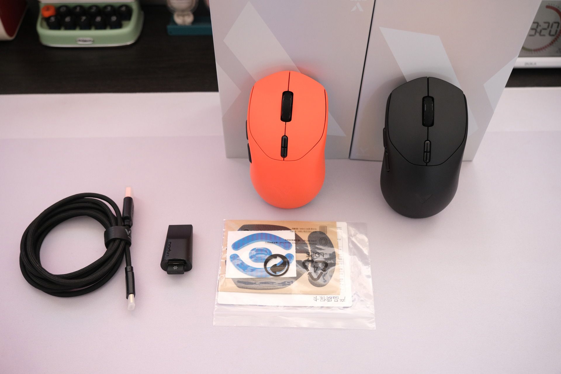 雷柏VT1系列的包装没玩花里胡哨的设计,硬纸盒+烫银 “VT” logo 的组合,拆箱时能明显感觉到质感。不是那种薄到一捏就皱的廉价包装,拿在手里有 “专业外设” 的分量感。打开后配件排列很规整,没有杂乱的线材缠绕,核心配件一目了然。比如有USB-C编织数据线、2组备用脚贴、nano级8K接收器等。