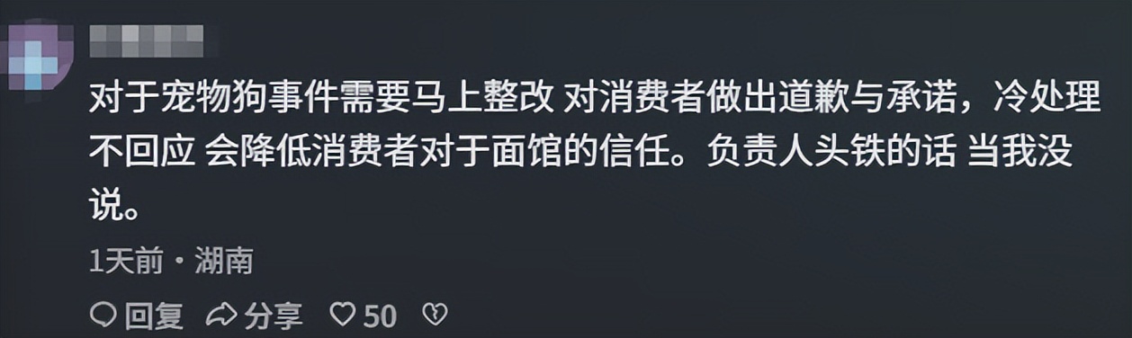 有的网友说:商家需要马上整改,对消费者做出道歉和承诺,一味的冷处理问题不回应,只会降低消费者对面馆的信任。