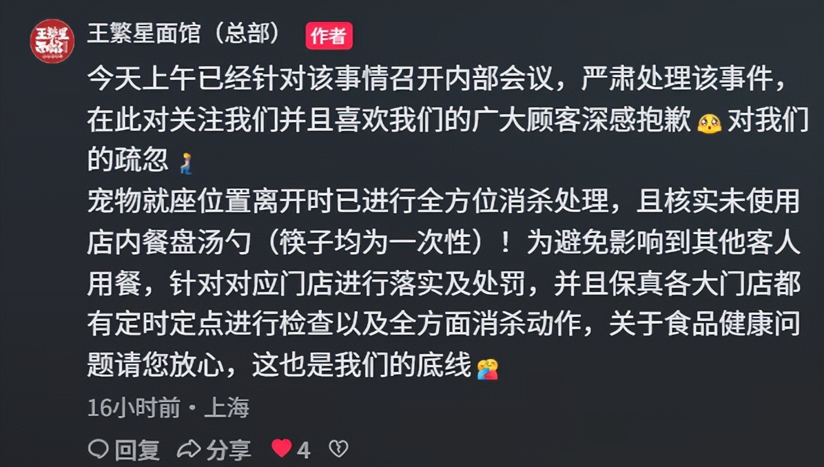 很快,商家也在评论区中进行了回应,表示内部已经召开了会议,会严肃处理该事件,对顾客深感抱歉,已经对宠物就坐位置进行全方位消杀处理,并且核实到狗在店内没有使用餐盘和筷子,并且对对应门店已经进行了落实和处罚。