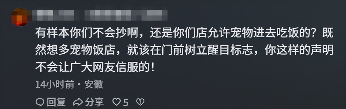 有的网友收:餐饮行业的底线就应该是禁止宠物入内,如果要赚养宠人的钱,就直接改名,正常人看见会躲开。